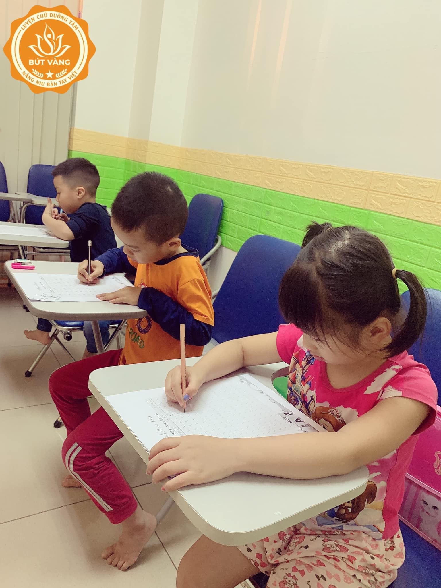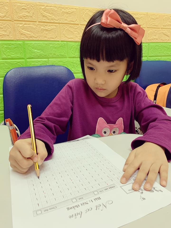 Từ 9 nét cơ bản → nhóm chữ → chữ ghép → chữ hoa → câu → đoạn. Mỗi bé được sửa lỗi 1:1 theo từng buổi.